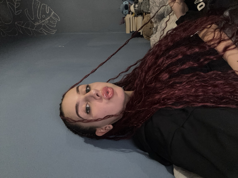 A female individual is depicted in a close-up, indoor setting. She has fair skin, dark eyes, and dark, well-defined eyebrows. Her lips are full, glossy, and puckered forward in a kissing gesture. Her hair is styled in numerous long, thin, dark red (burgundy) braids or twists that extend over her shoulders and chest. She is wearing a dark-colored, possibly black, hooded garment. Her visible left ear has multiple piercings. The background consists of a plain blue-grey wall. On the upper right portion of the wall, a white line-art drawing of Monstera plant leaves is visible. To the right of the subject, behind her, a stack of books, a blue plush toy resembling Stitch, and other indistinct plush animals are arranged on a surface, likely a bedside table or shelf. A light-colored, textured blanket or bedspread is partially visible beneath these items. The lighting appears to originate from the front-left, casting soft shadows. The specific location within Varna, Bulgaria, cannot be determined from the visual information provided in the image.