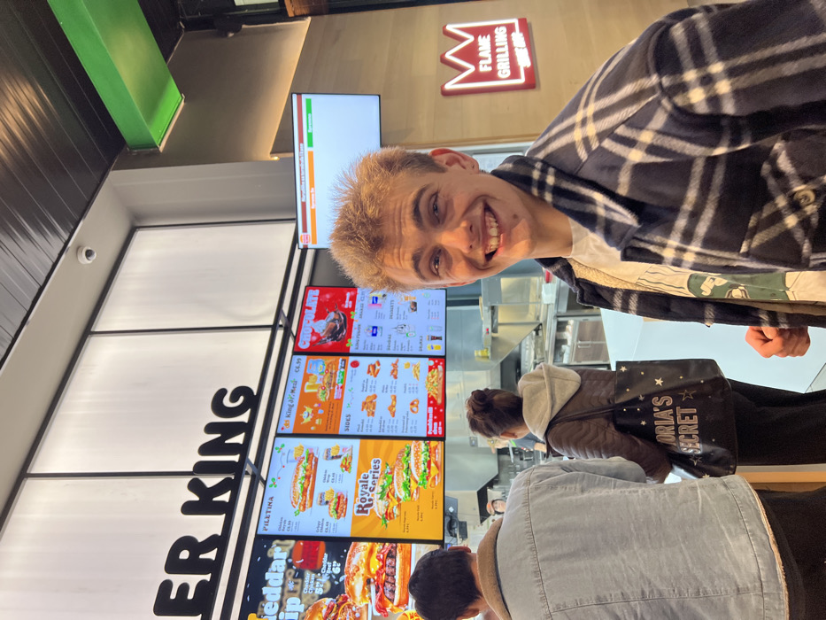 A vertically oriented photo shows a smiling individual wearing a plaid shirt in a Burger King restaurant