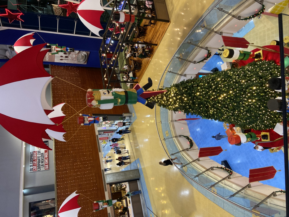 A large Christmas tree adorned with lights stands in a mall atrium. The atrium is decorated for the holidays with oversized toy soldier figures suspended by parachute-like decorations. People are seen walking on the mall's floor below. Red and white decorations hang from the ceiling. Several shops and a dining area with outdoor seating surround the central area. The mall's interior features light-colored floors and a warm, festive ambiance. A sign with Spanish text is visible, adding to the cultural context of the scene.