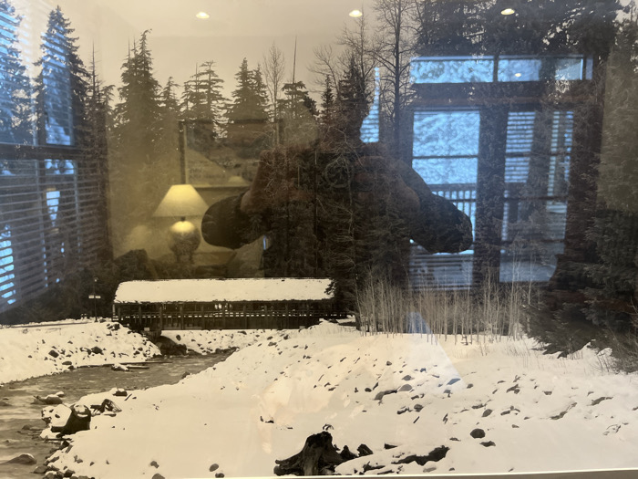 A monochrome photo shows a snow-covered landscape. A covered bridge spans a river with snowy banks. A cluster of bare trees stands on the right. The reflection in the photo glass reveals a room with blinds, a lamp, and trees. A dark shape, likely a person taking the photo, is visible. The scene is a blend of the photographed landscape and the reflected interior.