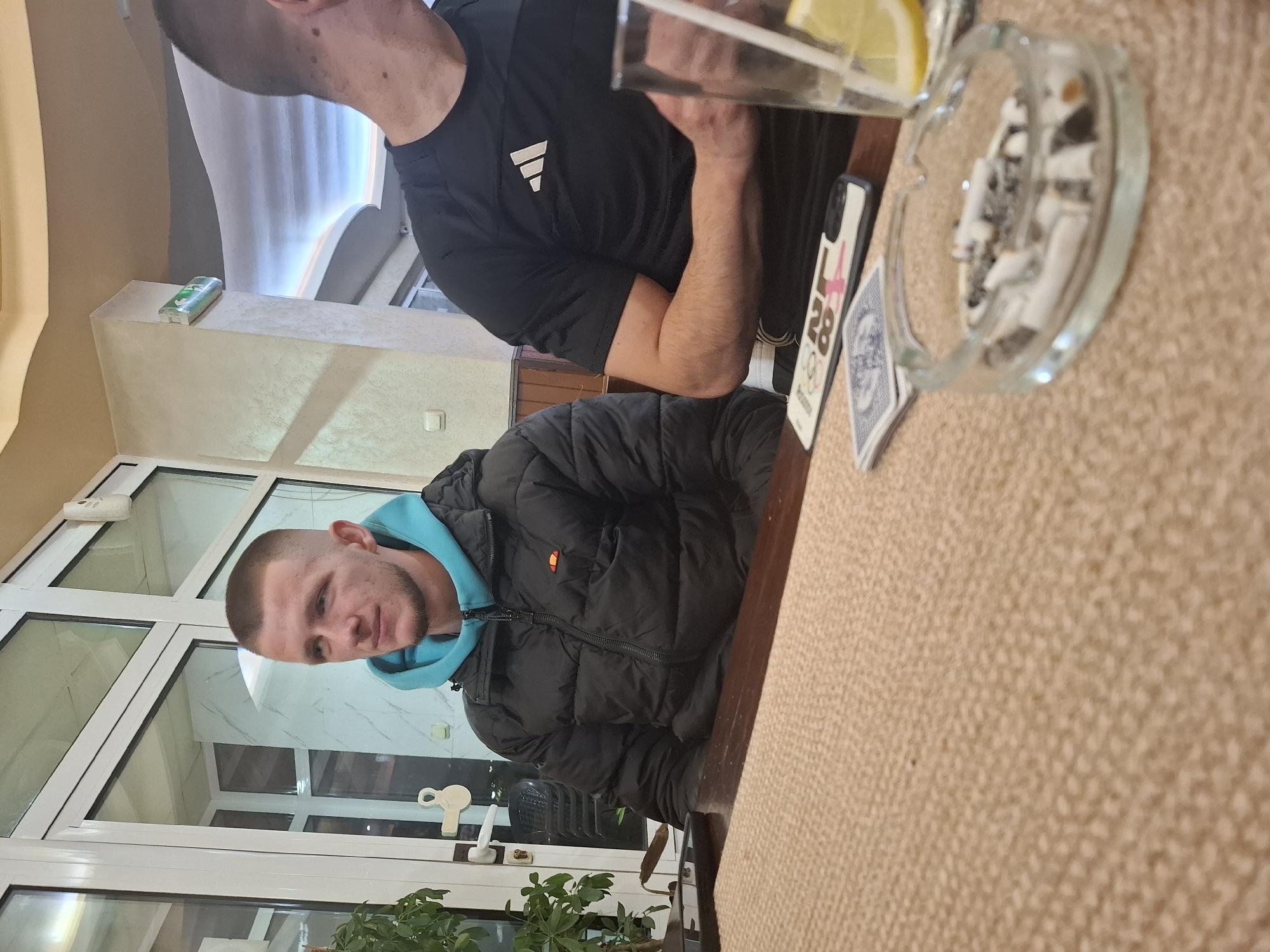 The scene depicts an indoor setting, likely a cafe or restaurant, located in Strazhitsa, Bulgaria. Two individuals are seated at a table covered with a light brown, woven-textured tablecloth. The primary subject, a male in his early twenties, occupies the left side of the frame, facing slightly left and upwards with a neutral expression. He has a very short buzz cut hairstyle and light stubble on his chin and jawline. He wears a black puffer jacket with an orange and white "Ellesse" logo on the left chest, over a light blue hooded sweatshirt with a zipper. To his right, partially visible, is the upper torso and right arm of a second male. He wears a short-sleeved black athletic shirt with a white Adidas logo on the right chest. His right forearm rests on the table, with his hands out of view. On the table in the foreground, from right to left, are several objects: - A clear glass ashtray filled with numerous cigarette butts and ash. - A tall, clear drinking glass containing a clear liquid, a white straw, and a yellow lemon slice. - A white smartphone lying face down, displaying partial characters including "28" on its case. - A small stack of playing cards, face down, with a blue patterned back design. The background features large white-framed glass windows and doors. Through the window on the left, a green plant is visible, and in the distance, what appears to be outdoor seating or another room. A white handle mechanism is present on the window frame. An air freshener dispenser is mounted on the wall above the window frame. The interior walls are light-colored, and a light-colored pillar or column with a textured finish stands behind the primary subject. An emergency exit sign with green illumination is affixed to this pillar. The ceiling is light-colored, with a distinctive curved architectural feature incorporating recessed lighting. Another building or interior space is visible through the background windows, including what looks like a security camera mounted high.