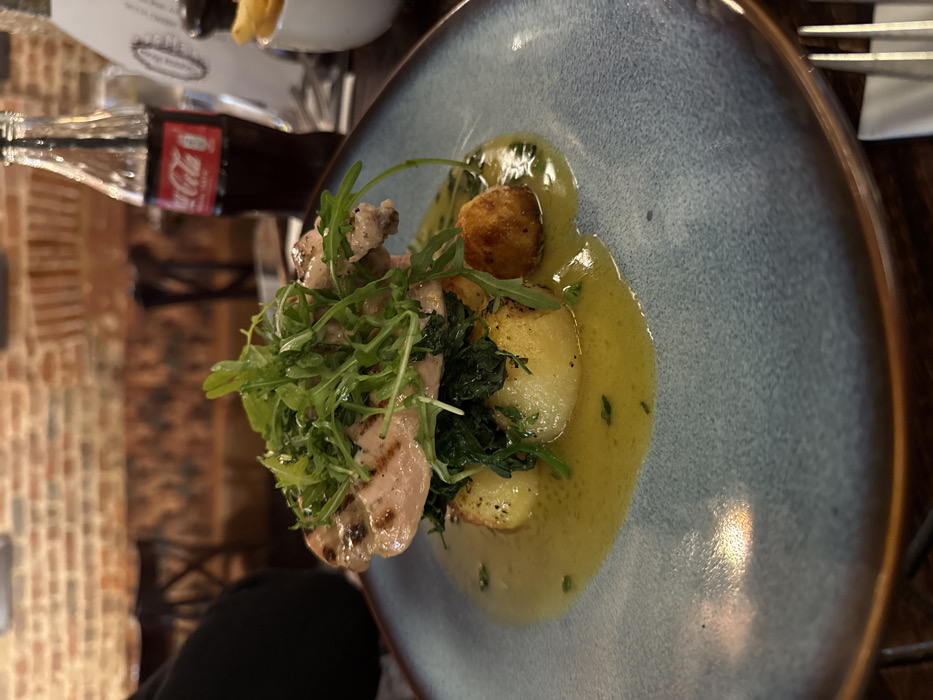 The image depicts an indoor dining scene within a restaurant or pub environment. In the foreground, a light blue-grey ceramic plate with a brown rim holds a prepared meal. The meal consists of a portion of grilled, light-colored protein, possibly chicken or fish, topped with a substantial garnish of green arugula (rocket) leaves. Beneath the protein and arugula are several golden-brown roasted or pan-fried potato halves, accompanied by dark green, cooked leafy vegetables, likely spinach. A pale yellow-green sauce, possibly a herb or lemon-based reduction, pools around the base of the food on the plate. To the immediate right of the plate, a clear glass bottle of Coca-Cola with a red label and white logo stands upright, containing a clear drinking straw. Further right, a partial view of a small white bowl filled with golden-brown french fries is visible. A white menu or table-standing sign with dark text is situated behind the Coca-Cola bottle. The table surface beneath these items is dark-colored. The background features a rustic red-brown brick wall, partially blurred. Dark wooden chairs with distinctive X-shaped backrests are faintly visible against the wall, suggesting additional seating. The lighting is dim, consistent with an atmospheric interior setting. A partial view of a person's dark-sleeved arm or shoulder is visible on the far left of the frame. The specific location within the city of London, United Kingdom, cannot be determined from the visual information provided; however, establishments with such interior design and culinary offerings are common throughout the city.