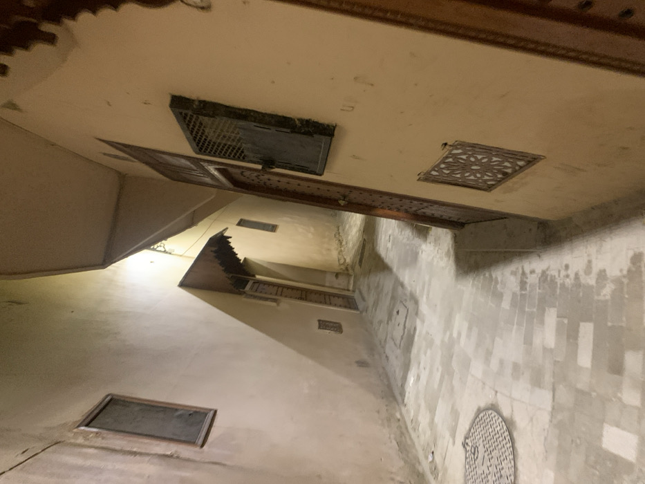 The image captures a narrow alleyway with high walls converging towards the top. Light decreases with distance. The ceiling is a beige color with various rectangular vents or openings, including one with intricate decorative patterns and another with a metal grate. The walls are textured and worn. The alley floor is made of stone, reflecting light from above. A manhole cover is visible in the foreground. A balcony with a railing appears on the wall further down the alley.