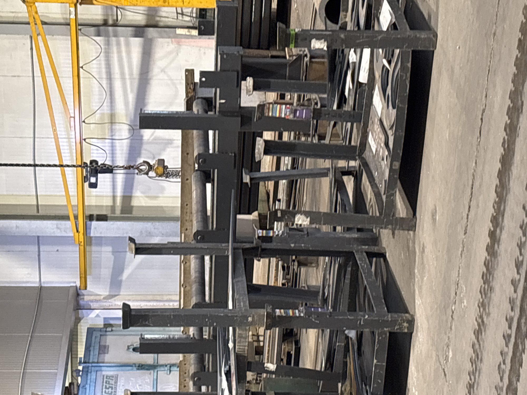 warehouse or industrial setting, likely in Ruptsi, Bulgaria. A yellow overhead crane is visible on the left side, supporting a chain hoist. A series of black metal racks filled with metal sheets and components occupy the center of the frame. The racks are densely packed, creating a cluttered appearance. The floor is concrete, showing signs of wear and tire tracks. The overall lighting suggests an indoor environment. No people are visible in the frame.