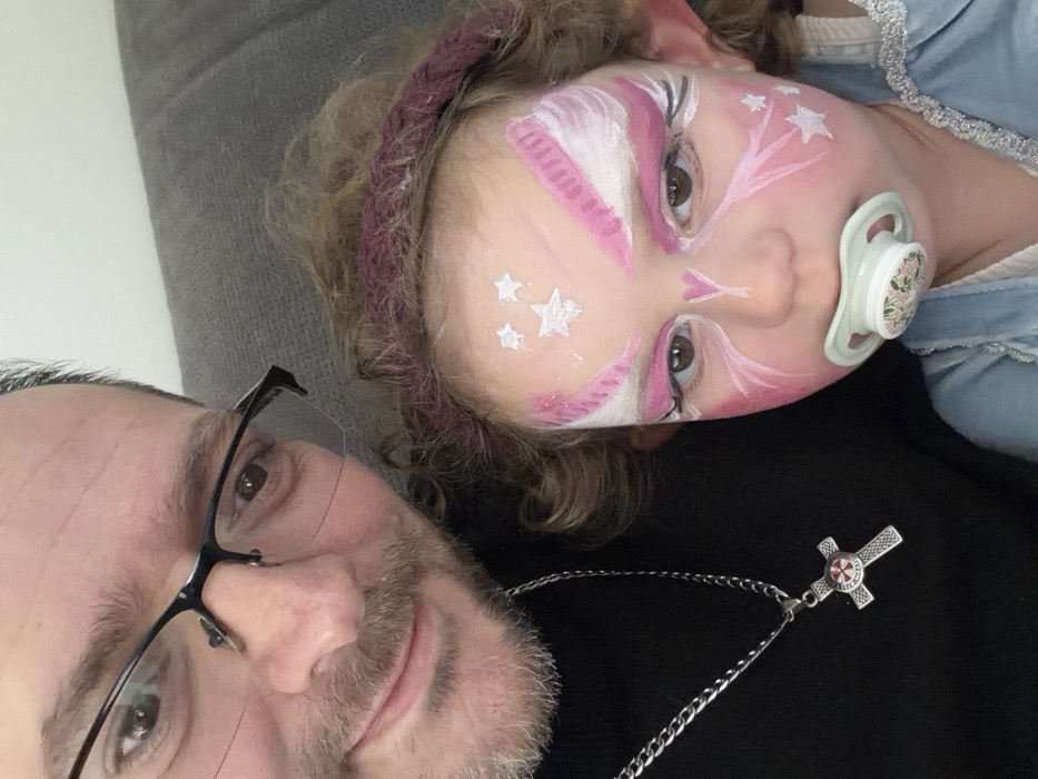 An indoor, close-up image taken in Trassem, Germany, features an adult male and a young child. The male, positioned on the upper left, has dark hair, a light beard, and wears black-framed glasses. He is dressed in a black turtleneck and a silver chain necklace with a textured Maltese cross pendant that has a circular red emblem in its center. He displays a slight smile and looks directly towards the camera. To his right, a young child, positioned in the lower right, has curly light brown hair and wears a dark pink braided headband. Her face is extensively painted in pink and white, creating a design that resembles winged patterns, with prominent white stars on her forehead and left cheek, and black eyeliner details. She wears a light blue garment with silver trim. A white and light green pacifier, adorned with a floral pattern, is in her mouth. Both individuals are partially framed against a plain grey upholstered surface, likely a sofa. The scene is illuminated by soft, frontal lighting.