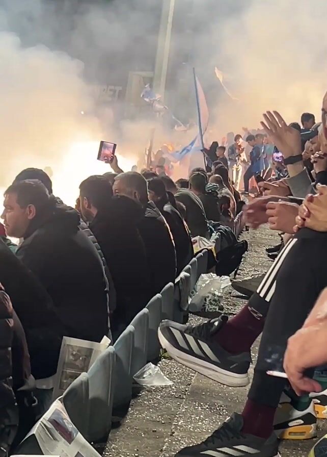 The video captures a stadium scene, likely during a soccer game, filled with fans. Dense white smoke billows, creating a haze in the foreground where seated spectators are visible, some recording the event on their phones. A flag is hoisted amidst the crowd. The camera then pans to reveal the green soccer field, surrounded by running tracks and empty stadium seating. The lighting is provided by overhead stadium lights. The atmosphere appears intense due to the smoke and enthusiastic fans.