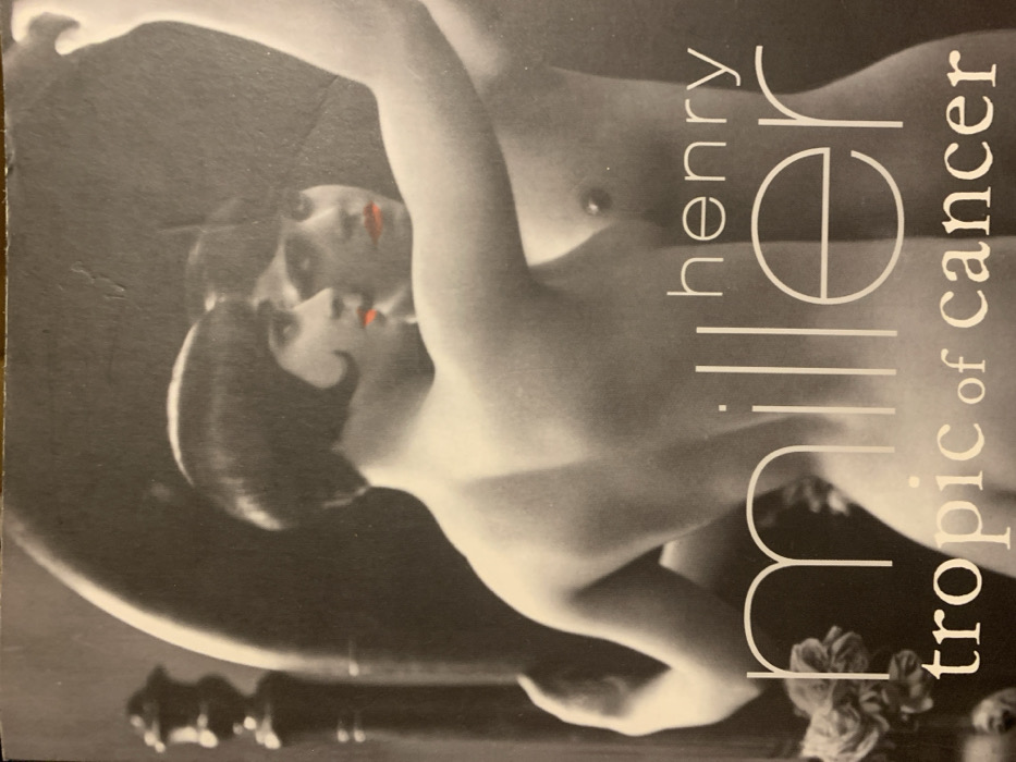 The image is a book cover featuring a black and white photograph of two nude women with red lipstick in an embrace. The book's title, "Tropic of Cancer," is written vertically along the right side of the image, along with the author's name, "Henry Miller." Flowers are visible in the lower right corner of the image. The women appear to be in a bathtub.