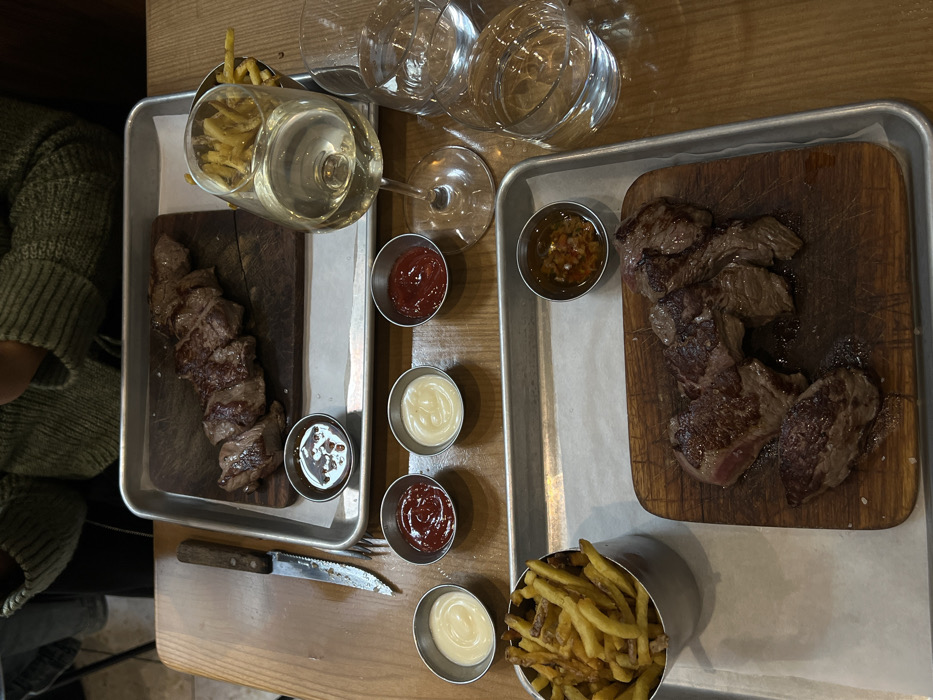 This image captures a dining table scene in Paris, France, set for two patrons. The primary subjects are two meals of steak frites. Each meal is presented on a rectangular metal serving tray, lined with white paper. A wooden cutting board holds a portion of sliced steak, appearing medium-rare, on each tray. On the upper tray, alongside the steak, is a serrated knife with a wooden handle and a partially visible fork. A small metal ramekin containing a dark brown sauce is also present on this tray. A metal bucket filled with golden-brown french fries is situated towards the right side of this tray, behind a clear wine glass. The lower tray features a similar arrangement of sliced steak on a wooden board, with a metal bucket of french fries positioned to its left. A small metal ramekin containing a multi-colored relish or chunky sauce is on the right side of this tray. Between the two trays, arranged centrally on the light-colored wooden table surface, are four additional small metal ramekins. Two of these contain a red ketchup-like sauce, and the other two hold a light yellow-white mayonnaise-like sauce. A stemmed wine glass, approximately half-filled with a clear, light-yellow liquid (likely white wine), stands on the right side of the table. Adjacent to it are two empty, clear drinking glasses, stacked or placed closely together. In the upper left background, the forearm and hand of a person, wearing a green ribbed sweater, are partially visible, indicating a diner present at the table. The overall environment suggests an indoor restaurant setting with warm lighting.