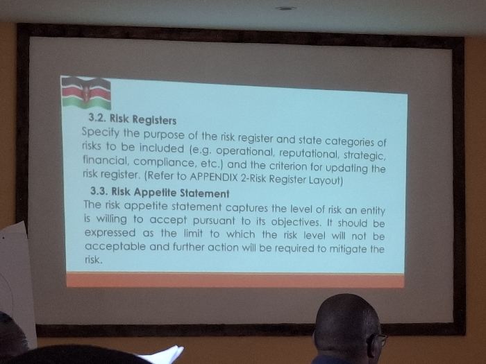 presentation screen in a room with light brown walls. The screen displays text about risk registers and risk appetite statements. The text is in black font on a light blue background. The top left corner of the screen displays a small Kenyan flag. The image is cropped from a wider scene, showing only the bottom half of the screen and a small portion of the wall and ceiling. The lower portion of a person's head with black hair can be seen in the bottom right corner of the image. This scene is most likely taking place in Karagita, Kenya, based on the coordinates provided, as Karagita is the most likely city in Kenya to be associated with those coordinates.