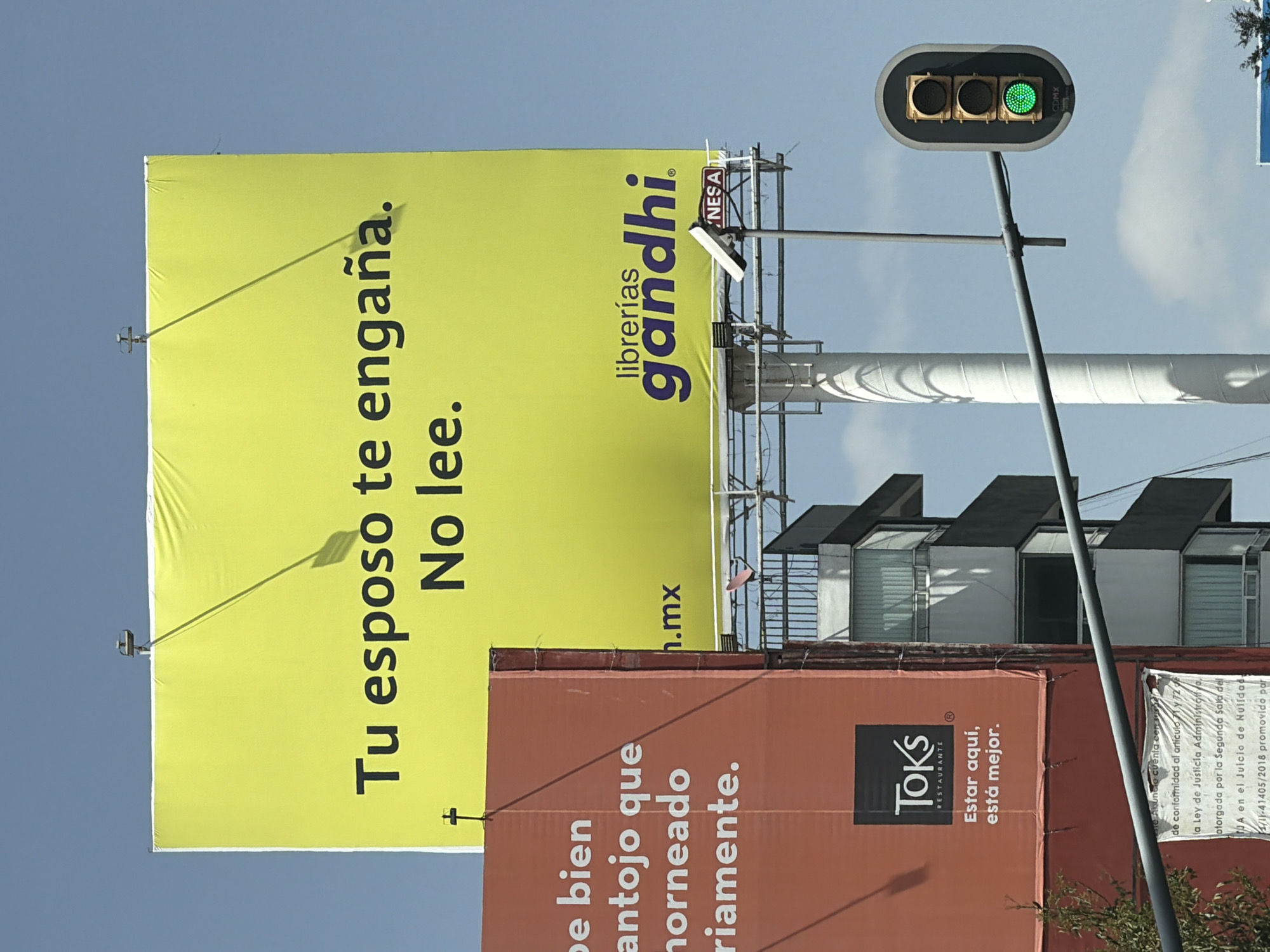 The image captures a street scene in Mexico City, Mexico, featuring a yellow billboard advertising "librerias gandhi" (Gandhi bookstores) with the slogan "Tu esposo te engaña. No lee." (Your husband is cheating on you. He doesn't read.). Below it is an orange billboard with the logo "TOKS RESTAURANTE" (TOKS Restaurant) and "Estar aquí, está mejor" (Being here is better). The advertisements are positioned against a background of buildings. A traffic light with a green light is visible to the right, and a few green leafy trees are visible in the upper right. A tall white cylindrical structure appears behind the billboards.