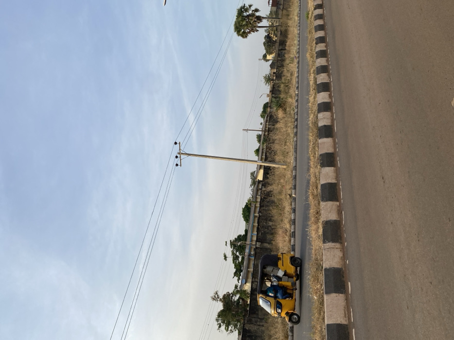This image depicts an outdoor street scene under a partly cloudy sky in the city of Television, Nigeria, during daylight hours. The upper two-thirds of the frame are occupied by a light blue sky with scattered thin white clouds. The lower third features a dark gray asphalt road. A curb, painted with alternating black and white rectangular stripes, runs horizontally across the mid-ground, separating the road from a dry verge. This verge, situated to the right of the road, is covered with light brown, dry grass and sparse vegetation. A yellow three-wheeled auto-rickshaw, with a black fabric canopy, is positioned on the road in the left lane, traveling from left to right. The driver, wearing a blue garment, is visible in the front left seat. At least one passenger, wearing a lighter-colored garment, is seated in the rear compartment, which also contains several light-colored, rectangular packages or pieces of luggage. Parallel to the road and behind the verge, a weathered, light brown concrete wall extends horizontally. Behind this wall, on the left side, multiple light-colored buildings with blue roofs are partially visible, surrounded by green trees and foliage. A tall, light brown wooden utility pole, equipped with three black ceramic insulators, stands on the verge slightly to the right of the frame's center. Multiple dark-colored electrical wires extend horizontally across the sky, connected to this pole. Further to the right, behind the wall, a prominent palm tree with a thick trunk and green fronds is visible.
