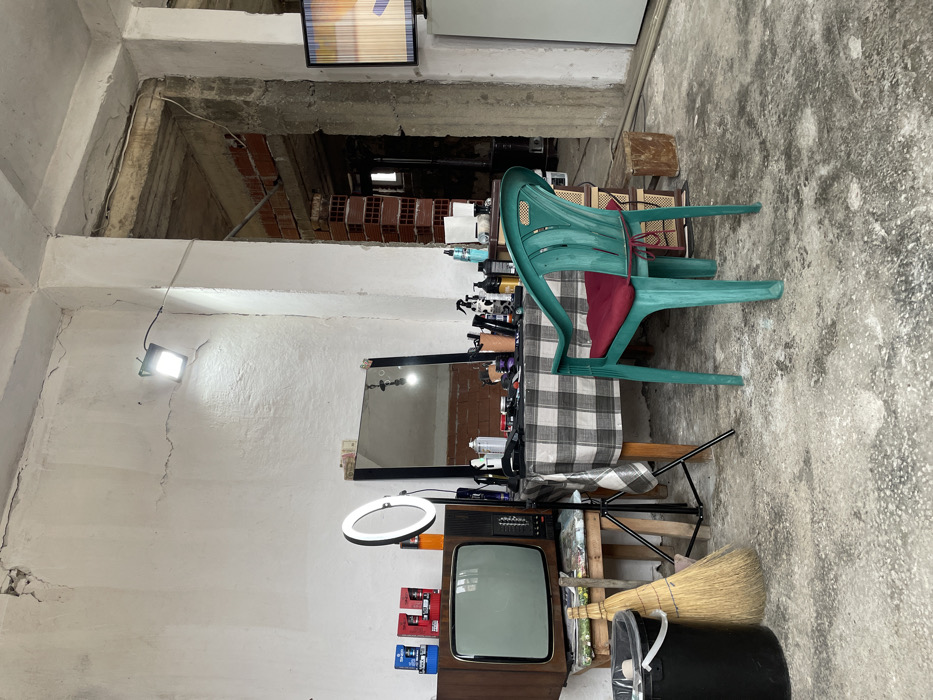 The image depicts an informal barber or styling station within a semi-finished or industrial-style room in the city of Unknown, Unknown