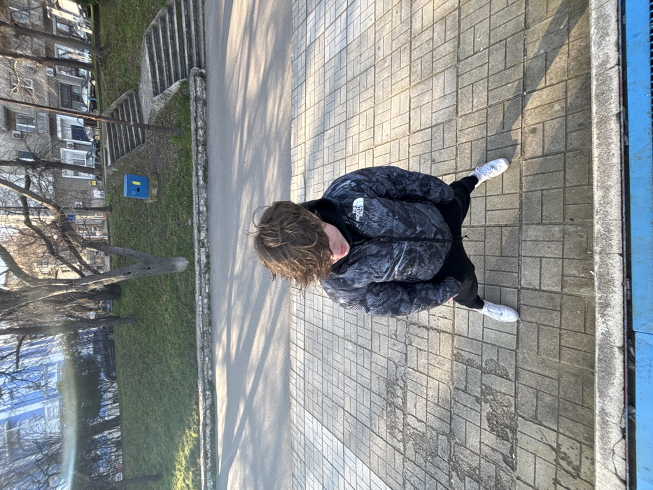 A high-angle photograph captures a young individual standing on a light grey paved sidewalk, viewed from above, with their back partially to the camera and head tilted downward, obscuring their face. The individual wears a grey and black abstract-patterned puffer jacket with a "The North Face" logo on the left chest, a black hooded sweatshirt underneath, black pants, and white sneakers. The sidewalk consists of rectangular pavers, with a thin blue metal edge visible at the very bottom of the frame. Beyond the sidewalk, an asphalt road stretches across the midground, showing faint tire marks and long shadows cast from the left, indicative of bright sunlight. To the right of the road, a grassy incline features several bare deciduous trees and a bright blue utility box on the grass. Concrete steps ascend the grassy slope on the right side of the image. In the background, multiple multi-story buildings with typical European architecture, windows, and balconies are visible, with parked or moving vehicles on an upper road. On the far left, a larger building with a blue facade and vertical elements is partially seen. The scene is located in the city of Varna, Bulgaria.