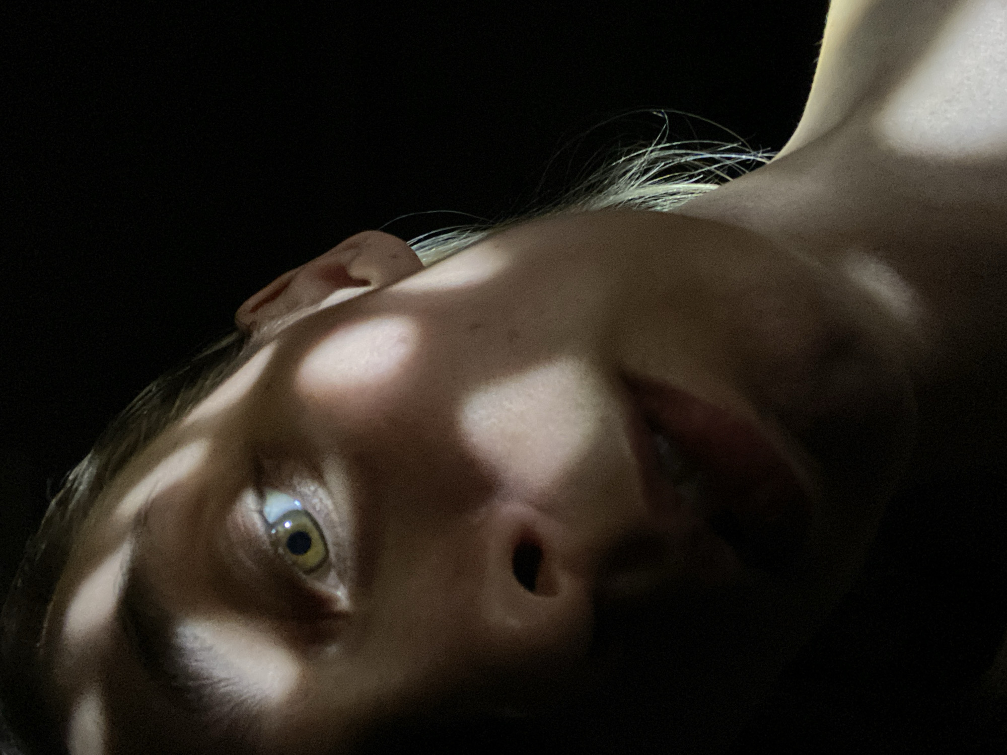 A close-up, tilted view of a person's face in stark light and shadow
