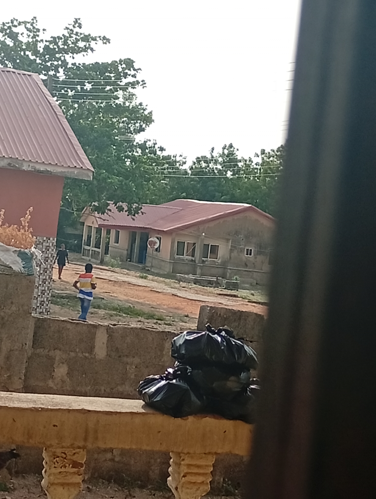 Outside a building in Adankolo, Nigeria, a stack of black trash bags sits on a concrete ledge. Two people walk on the path in front of the building. One person wears a blue and yellow-striped shirt. Buildings with red roofs are partially visible among trees. Power lines cross the scene.