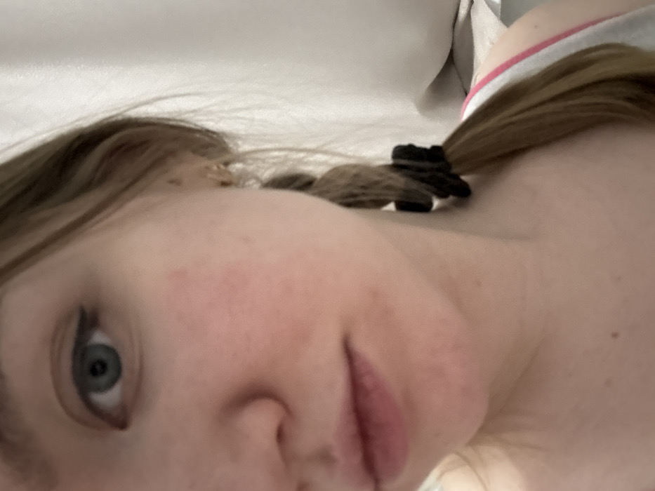 A close-up of a fair-skinned person with light brown hair pulled back into a ponytail with a black hair tie. The person is lying down, face tilted towards the camera. Features visible include a blue-green eye, a small nose, and pink lips. Freckles are noticeable on the cheek. A white pillow is partially visible in the background, with a pink and grey strap suggesting clothing.