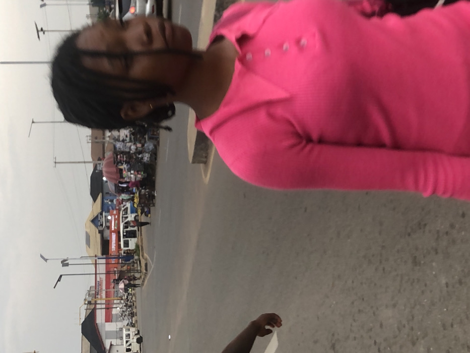 A woman in a pink top stands on a street. A line of stalls and vendors are visible in the background. A white van and several motorcycles are also visible near the stalls. The woman has dark hair and is partially obscured by it. Light poles line the street. Part of a hand is in the bottom center of the image. The day appears overcast.