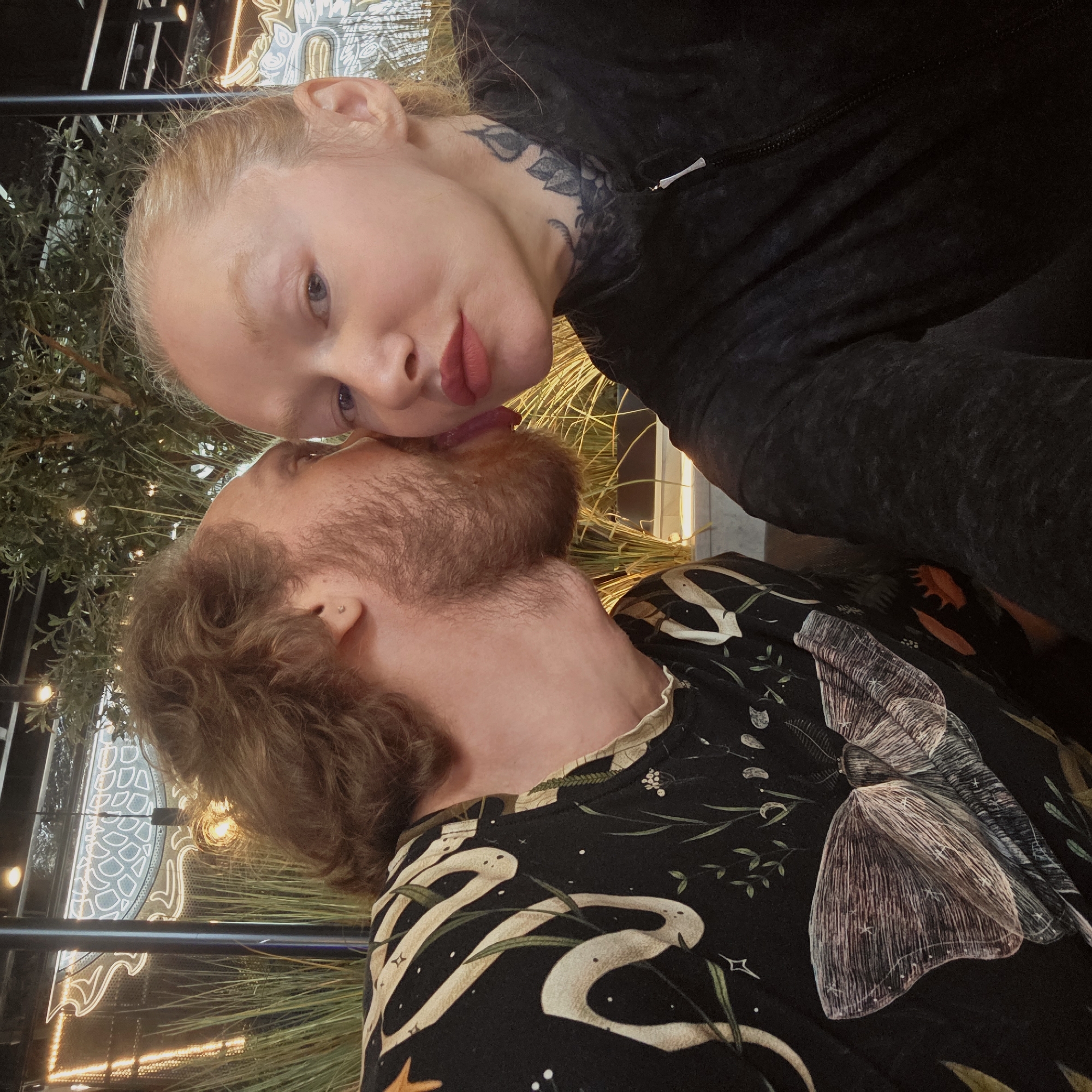 Two people are captured in a close-up shot, appearing to be indoors or in an enclosed space, possibly a restaurant or bar with decorative lighting and greenery visible in the background. The person in the foreground, slightly lower in the frame, has reddish-brown hair and a beard. They are wearing a dark-colored shirt adorned with patterns of celestial objects, including a moth. The person above has blonde hair and a tattoo on their neck. They wear a black hoodie or jacket. The two people are interacting, with the blonde individual appearing to lightly touch the bearded person's beard with their tongue. The lighting suggests it is evening. The presence of decorative greenery and neon lighting implies an urban setting. There's no explicit evidence pointing to the city of Saint Petersburg, Russia.