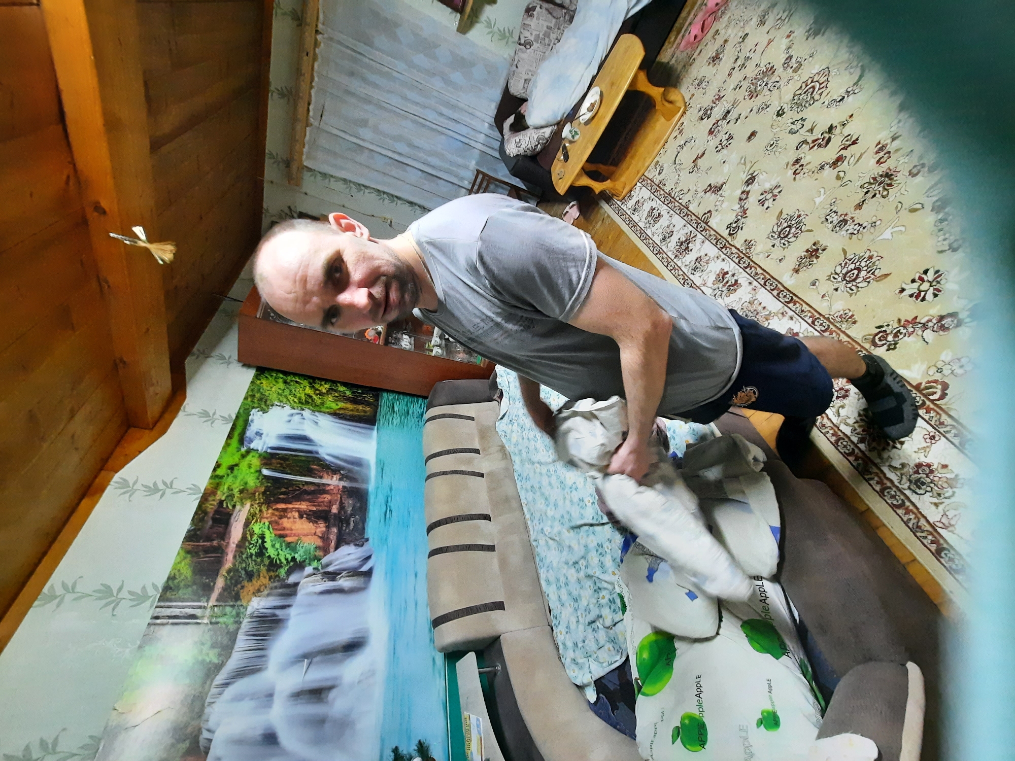An indoor scene in Архангельское, Russia, depicts a residential living space. In the center-foreground, a bald, light-skinned adult male wearing a grey t-shirt, dark shorts, and dark slippers stands, holding a bundle of light-colored fabric with both hands, looking directly at the camera. The floor is covered by a beige patterned rug featuring floral motifs in shades of red, green, and cream. To the left, a beige sofa with brown vertical stripes is partially visible, covered by a light blue and white floral patterned sheet. On this sofa, several white pillows with green apple logos and "APPLE" text are present. A small white side table with an object on it and a portion of a decorated Christmas tree are also visible on the left. The wall behind the sofa features a large wall mural depicting a vibrant multi-tiered waterfall within a green landscape. Above the mural and on the adjacent walls, wallpaper with a subtle green leaf pattern on a light background is applied. A tall, narrow, dark wooden cabinet with glass doors displaying various items stands behind the male. The ceiling is constructed from light brown wooden planks, from which a small, decorative, bundled straw object hangs. To the right, another brown sofa is visible, on which a person is partially obscured under a light blue blanket, appearing to be resting. In front of this sofa is a light wooden coffee table with a curved base, holding a small white plate with remnants, a white cup, and dark sunglasses. Behind the right sofa, a white curtain covers a window. A single pink slipper is on the floor near the right sofa. The overall lighting is bright and even.