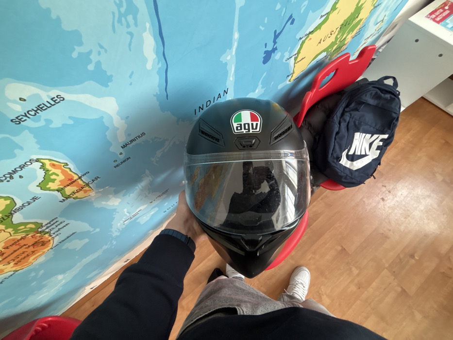 The scene depicts an indoor setting in Zlatograd, Bulgaria, featuring an individual and personal effects against a world map backdrop. A light-toned wooden floor occupies the lower portion of the frame. A large, multi-colored world map, illustrating regions including Southern Africa, the Indian Ocean, and parts of Australia, is affixed to a vertical surface. An individual's lower torso, legs, and right arm are visible. The individual wears grey trousers and white athletic shoes. Their right hand, clad in a dark blue long-sleeved garment, rests upon a black AGV full-face motorcycle helmet. The helmet displays the AGV logo with Italian flag colors and is equipped with a clear visor, which reflects a blurred figure, likely the photographer. This helmet is positioned on a red, molded plastic chair or stool. A dark blue Nike drawstring backpack with a prominent white 'NIKE' emblem is situated on the floor next to the red chair. A white shelving unit is partially visible in the bottom right quadrant.