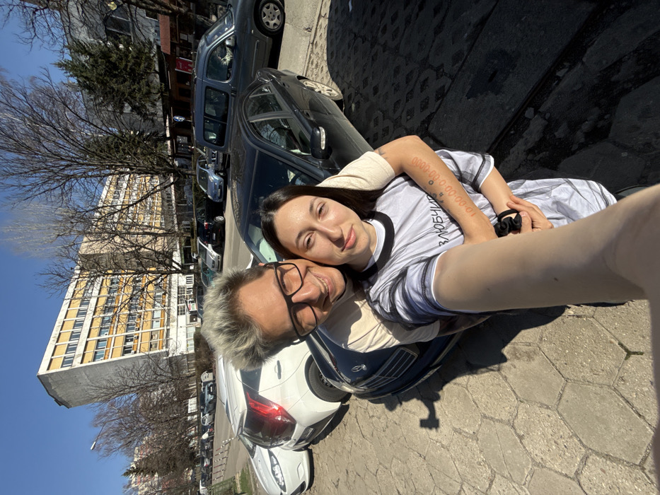 The image depicts two individuals, a male and a female, in a selfie-style photograph taken outdoors on a sunny day. The scene is located in Sofia, Bulgaria, specifically in front of the Medical University - Sofia, identified by the distinctive multi-story administrative building with a prominent angled left facade and yellow-framed windows visible in the background at 15 Acad. Ivan Geshov Blvd. The female subject, positioned on the right and holding the camera, has dark hair and a neutral expression, looking directly forward. She wears a white t-shirt with black trim, featuring Cyrillic text ("ВЛЮБИТЬ" - "to fall in love") and a sequence of numbers ("10-00-00-00-00-0000"). Her left arm is extended, holding the camera, while her right arm is wrapped around the male subject. The male subject, on the left, has short, light-colored hair and wears black-framed glasses, smiling broadly towards the camera. He wears a light beige t-shirt, and a tattoo is visible on his left arm as his left arm encircles the female. Both subjects appear to be young adults. Behind the couple, a dark-colored Mercedes-Benz sedan is parked. To their left, a white Ford Fiesta hatchback is visible, and further down the street, a line of various parked cars (including sedans and a dark minivan/SUV) extends along a sidewalk demarcated by parking bollards. The foreground ground is paved with hexagonal concrete blocks, transitioning to asphalt further back where additional vehicles are parked. The background features the main building of the Medical University - Sofia, a large concrete structure with multiple floors. Bare-branched deciduous trees and some evergreen trees are scattered around the street and buildings. The sky is clear and blue, and direct sunlight casts distinct shadows of the subjects and vehicles on the ground, indicating bright conditions.