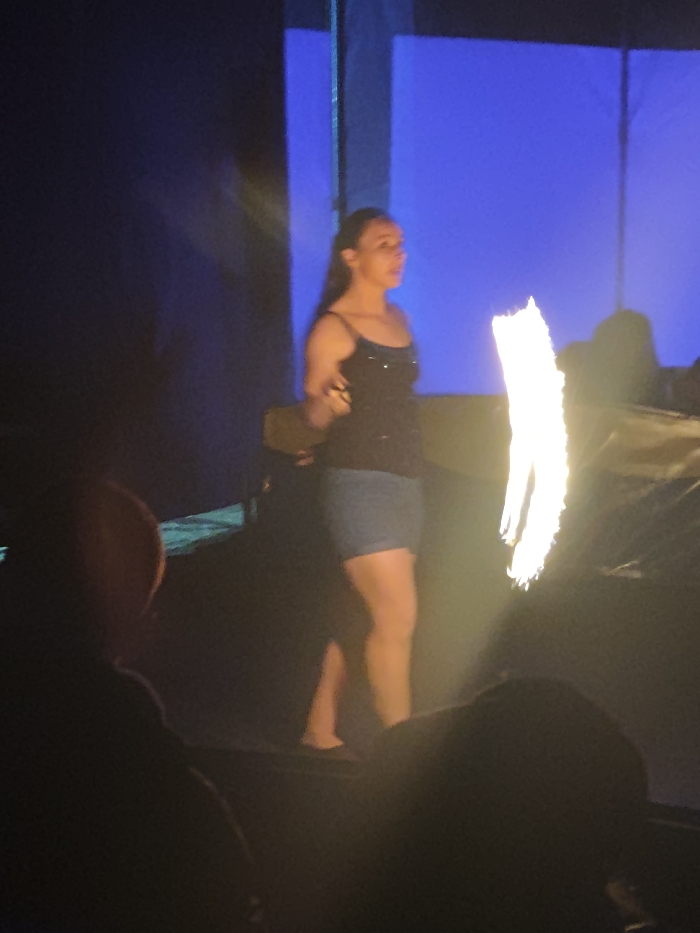 A woman in a black tank top and denim skirt stands on a stage with a blue background. She is facing slightly to the right, looking off into the distance. There is a bright, elongated flame or light source beside her. The foreground is dark, with the silhouettes of heads presumably belonging to audience members. The lighting casts strong shadows and highlights, obscuring some details of the scene.