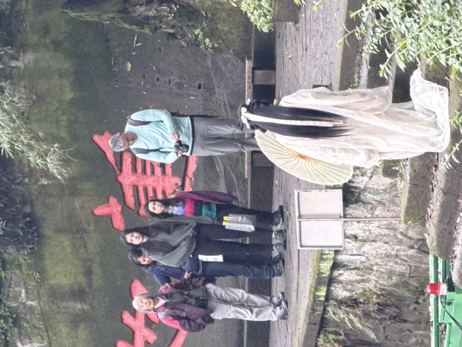 This image depicts an outdoor scene in Yuzhong District, China, showing a group of onlookers observing a person in traditional attire. In the foreground, a person with long, dark hair styled with a white ribbon, dressed in a flowing, light-colored traditional garment, descends stone steps. This individual holds a light-colored paper umbrella over their left shoulder and faces away from the camera. To the left, at the base of a stone wall, a green structure with a red warning light is partially visible. Two blank rectangular signs on poles are positioned on a lower ledge, above the green structure. In the midground, on a stone path above the steps, a group of five individuals stands observing the scene. From left to right: an elderly East Asian woman in a purple jacket and grey pants; an East Asian woman in a dark blue jacket; a young woman with long dark hair in a dark green hoodie and black pants; a young woman in a multi-colored striped top, purple jacket, and black pants, holding a plaid shopping bag; and a Caucasian male in a light blue long-sleeved shirt and grey pants, wearing a dark backpack, who is looking down and adjusting a black camera. The background consists of a large, moss-covered concrete or stone wall with prominent red Chinese characters painted on it. Green foliage, including bamboo, grows on and around this wall. A simple stone bench is visible against the wall behind the group of onlookers. The environment features multiple stone walls, steps, and paths, indicating a landscaped or historical area, with visible moss on many stone surfaces. The lighting appears overcast.