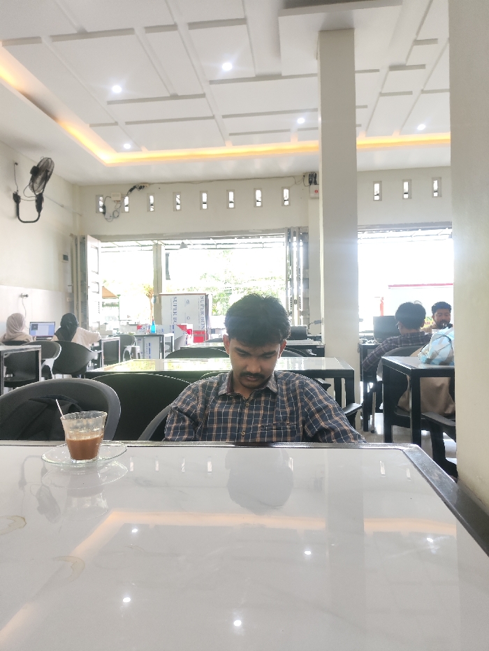 A person in a blue plaid shirt sits at a table in a brightly lit cafe. A glass of liquid sits to their left. Other patrons occupy tables in the background, and a ceiling fan is mounted on the wall. The cafe features large windows and a white ceiling with recessed lighting. The table in the foreground has a reflective surface.