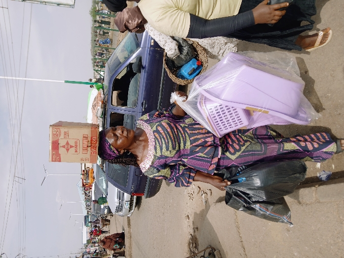 A busy outdoor street scene in Masvingo, Zimbabwe, is observed under clear daylight conditions. In the foreground, a middle-aged woman of African descent, wearing a multi-patterned purple, green, and black two-piece garment and a matching headwrap, walks toward the left. She carries two full black plastic bags in her left hand and a clear plastic bag containing new lavender plastic housewares (including a basin and a basket) in her right hand. To her immediate right, a second woman, partially visible and wearing a light yellow top and a brown head covering, carries a woven basket containing a blue plastic container. In the mid-ground, a dark blue Volkswagen station wagon is present, with a large cardboard box prominently displaying "MAGGI" and "5.728g" secured to its roof rack. Other vehicles, including a silver sedan, are visible further down the street, indicating active traffic. The environment features unpaved, dusty ground mixed with paved areas, modern streetlights, and utility poles overhead. Numerous pedestrians are scattered throughout the background; a distinct line of individuals is visible in the far background on the right.