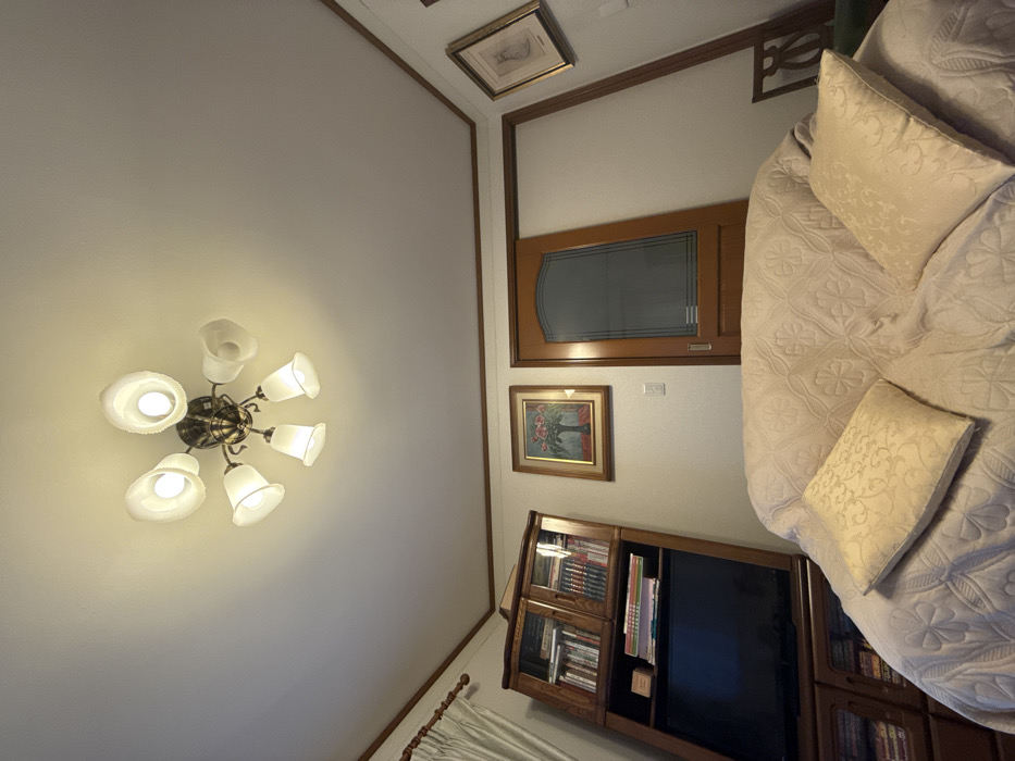 A room features a bed with patterned bedding and two pillows, positioned to the right. On the wall, there is a framed picture above a smaller picture, and below these is a wooden cabinet containing books and a television. A chandelier hangs on the left wall. The room is also decorated with framed artwork near the top of the wall. The image seems to be rotated.