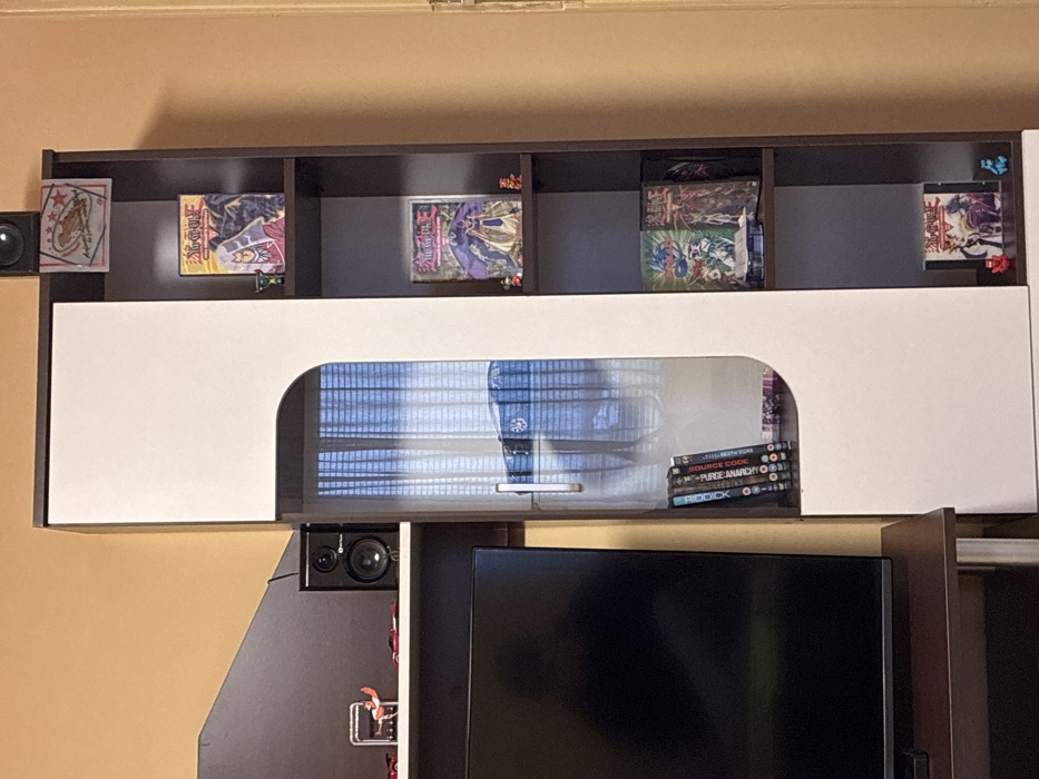 An indoor scene in Pastrogor, Bulgaria, displays a media and storage unit against a two-tone wall. The upper wall section is light orange/beige, transitioning to dark brown below, with a diagonal seam on the left. The central furniture piece is a multi-part unit. On the left, a dark-colored flat-screen television sits on a dark brown media stand. Above the television, a dark brown shelf holds a black ART-branded speaker and a small red sports car model, along with a small figurine depicting a character in red and white. To the right of the television, a tall cabinet features a white front with a rounded, clear glass panel. Reflected in this glass panel are horizontal window blinds and a dark-colored vehicle parked outdoors. Inside this cabinet, several DVD or Blu-ray cases are stacked horizontally. Further to the right, a dark brown open shelving unit is filled with items: * The top shelf contains a small black speaker and a framed item featuring a red star design. * The second shelf holds a Yu-Gi-Oh! branded anime/manga DVD case and a small green goblet. * The third shelf displays another Yu-Gi-Oh! branded DVD case and two small figurines, one red and one orange. * The fourth shelf contains two additional Yu-Gi-Oh! branded DVD cases and a small white object. * The bottom shelf features a Yu-Gi-Oh! branded DVD case flanked by two small figurines, one red and one light blue.
