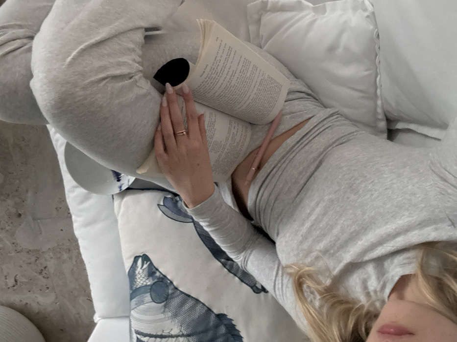 The image displays an overhead view of an individual reclining indoors on white bedding in the city of Coral Gables, United States of America. The subject is an adult female, partially visible from the chest down, with long blonde hair. She is dressed in a long-sleeved grey top and grey lounge pants, with a portion of her midriff exposed. Her right hand, featuring light pink manicured nails and a gold ring on the ring finger, rests on an open book placed on her lap. A second open book is also on her lap, and a light pink pen is tucked into her pants, resting on her midriff. The scene depicts the individual engaged in reading. She is supported by white pillows and cushions, one of which has a blue and white marine-themed illustration. A white bowl with blue decorative accents is partially visible near her leg. The background shows a light-colored, possibly stone or tiled, floor.