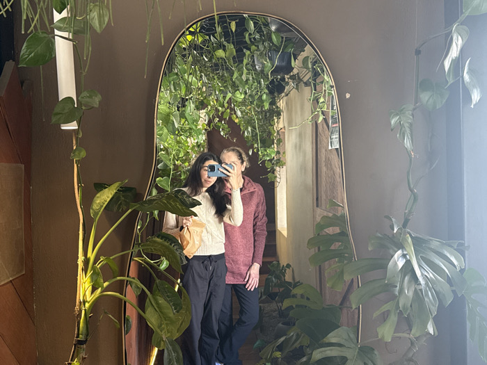 Two people are reflected in an ornate mirror surrounded by leafy green plants. One person, positioned left, holds a cell phone and a brown bag. They wear a cream-colored sweater and dark pants. The other person, to the right, dons a maroon jacket and dark pants. The mirror hangs on a brownish wall and reflects a brighter interior with more greenery. A large plant is situated to the left of the mirror, another is to the right, and vines cascade from the top.