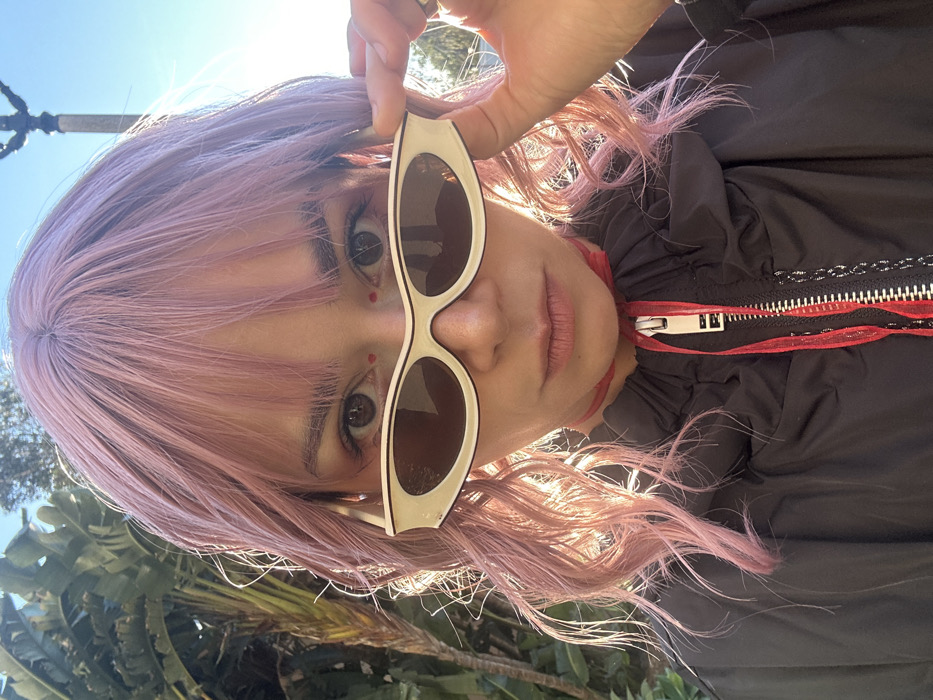 A person with light pink hair holds up cream-colored sunglasses. Red dots adorn each cheek. The individual wears a black jacket with a red accent around the zipper. The image is taken from a low angle, showing a glimpse of the sky and palm trees in the background. The person looks directly into the camera with a neutral expression.