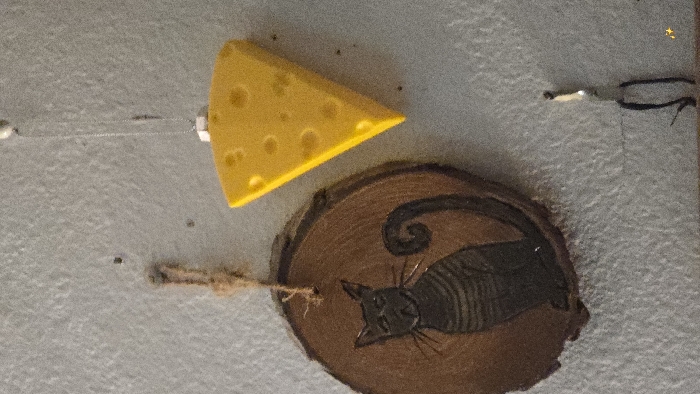 The image displays a section of a light gray, textured wall, likely indoors, in Lompoc, United States. The specific location within Lompoc is not identifiable from the visual content. Two primary decorative objects are visible. On the left, a circular wooden slab, approximately 15-20 cm in diameter, features natural bark edges and is suspended by a length of brown twine. A stylized black or dark brown cat is painted centrally on the wood, depicted in a seated position facing the viewer, with distinct whiskers and a curled tail. To the right of the wooden slab, a bright yellow, triangular ornament, shaped like a wedge of Swiss cheese with multiple circular indentations, hangs from a thin metallic string or chain. This ornament possesses a glossy surface finish. In the lower right portion of the image, a small, dark, thin object, possibly a piece of wire or string, is partially visible hanging down. The wall surface exhibits minor textural variations and scattered dark specks. No individuals or dynamic actions are depicted in the scene.