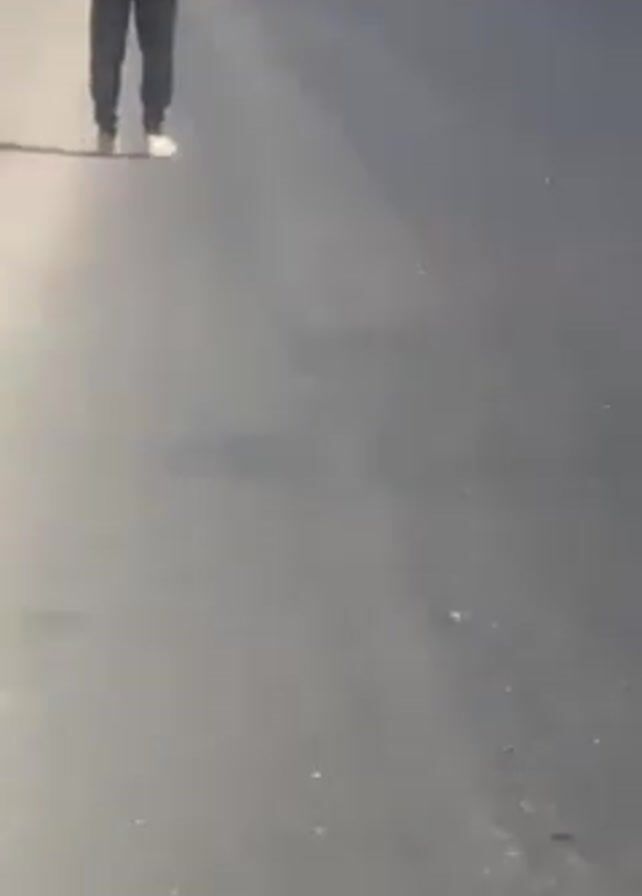 The video depicts a roadside scene alongside a highway. A large white truck, covered in dirt, is parked on the shoulder of the road. Beside it, an individual wearing a brown jacket and dark pants is walking in the same direction as the traffic. The road is relatively busy, with cars and trucks passing by in both directions. The sky is clear and blue, and the overall atmosphere appears to be sunny. In the distance, there are hints of desert landscape, suggesting the location might be in a dry or semi-arid area. There is a dark liquid stain on the road near the truck.