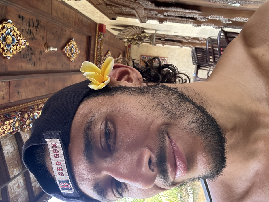 A close-up photo of a man with a beard wearing a black baseball cap with the words "RED SOX" on it. A yellow flower is tucked behind his ear. He gazes directly into the camera with a slight smile. The background consists of ornate wooden carvings on a wall and ceiling. The image is taken in a horizontal orientation.