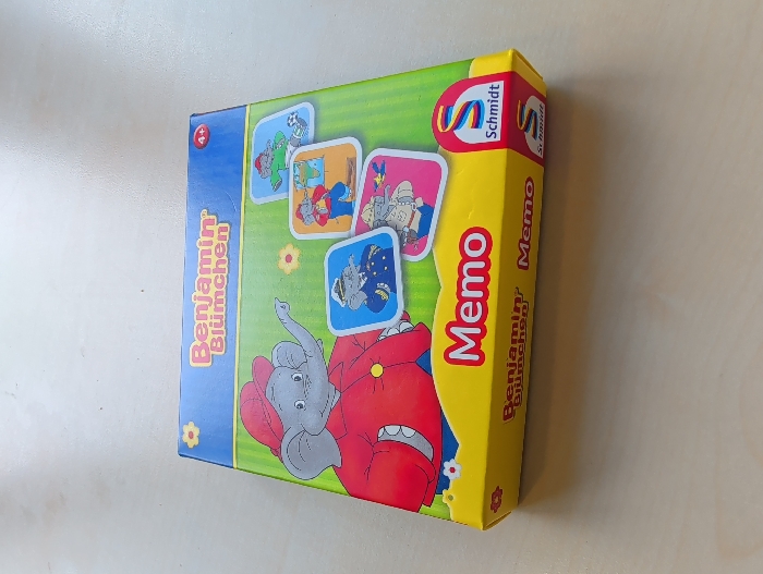 - "A cardboard game box, titled "Benjamin Blümchen Memo," is depicted from a slightly elevated angle, resting on a light-colored, wood-grain surface" by FM-eaG8q2, licensed under CC BY 4.0