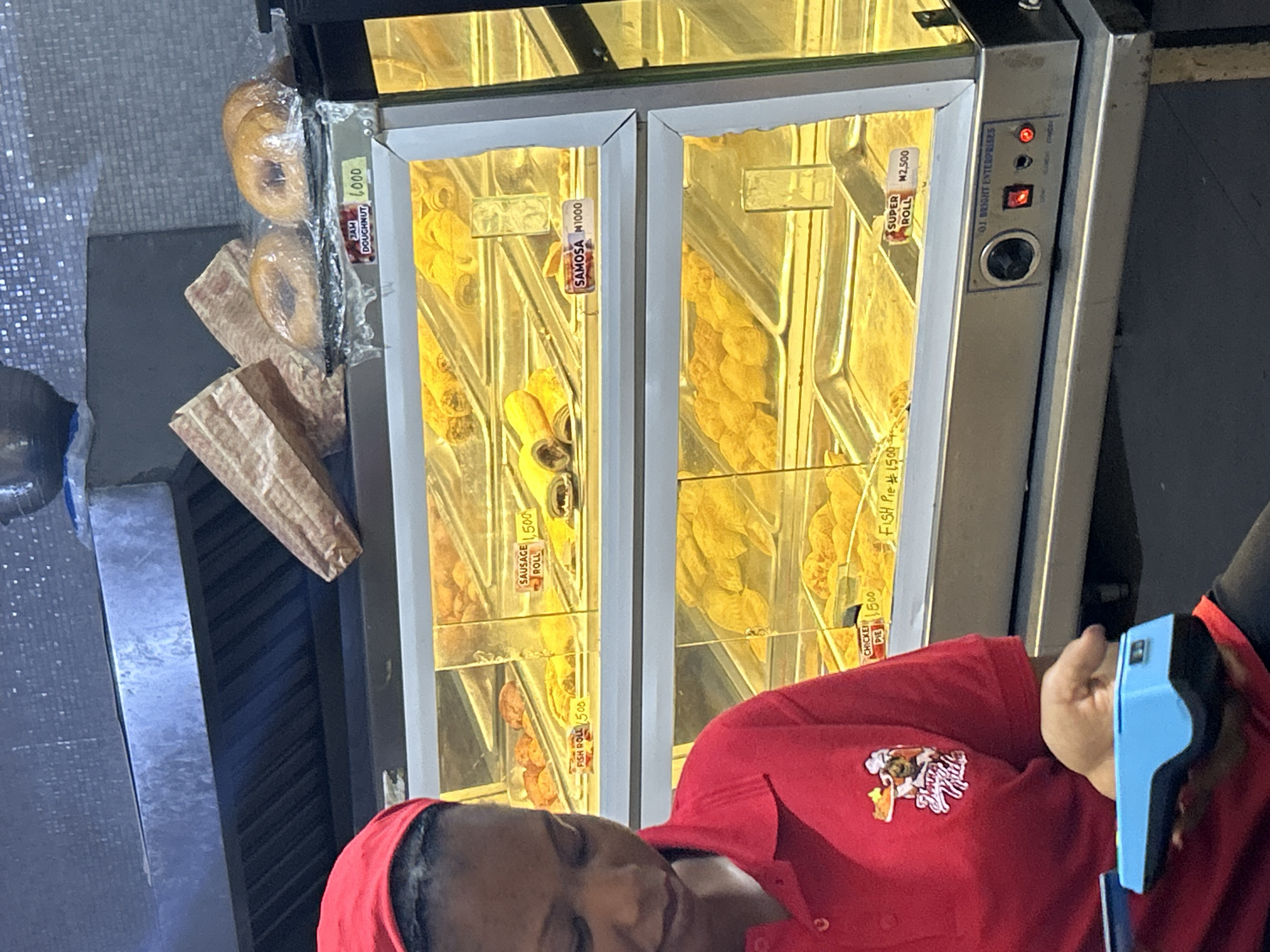 Here is a description of the image: The image shows a street food vendor in Jos, Nigeria. The vendor, wearing a red uniform, is processing a payment using a light blue point-of-sale device. Behind the vendor is a heated display case containing various pastries and snacks, including doughnuts, samosas, super rolls, sausage rolls, fish rolls, and chicken pies. Each food item has a corresponding price tag in Nigerian Naira (₦). The display case is labeled "O.J. Bright Enterprises."