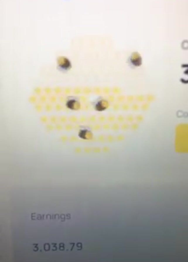 close-up of a computer screen displaying what appears to be the Honeygain wallet interface. The screen shows a honeycomb pattern filled with small yellow dots and several animated bee icons moving across it. Text near the top reads "Honeygain wallet." Below the honeycomb is the word "Earnings" followed by the number "3,038.79."