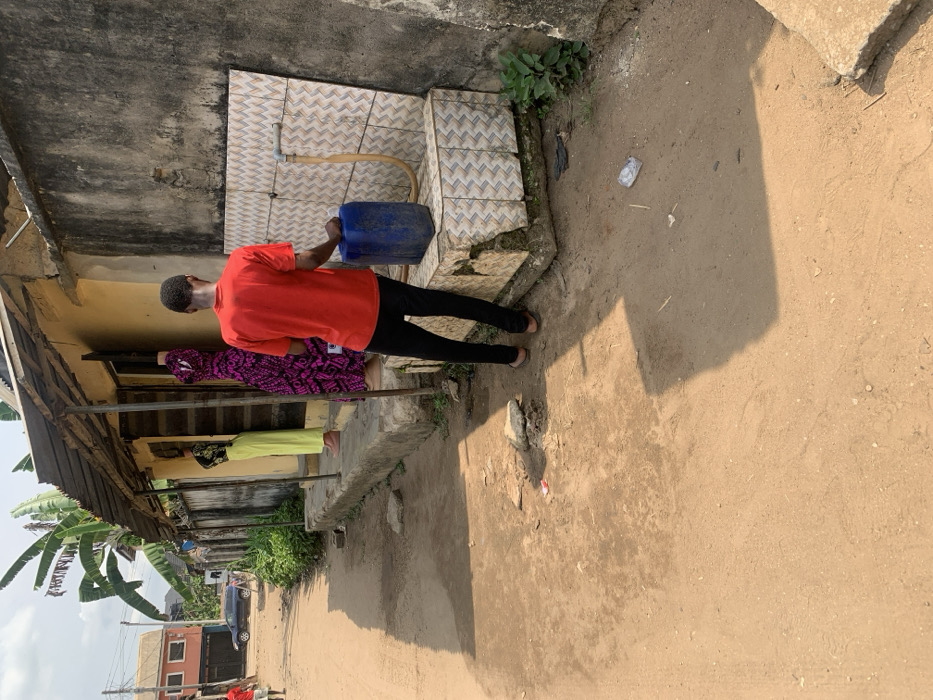 The image depicts an outdoor street scene in Umuode, Nigeria, characterized by a dirt road alongside residential and commercial structures under a bright, partly cloudy sky. In the foreground, a male figure, viewed from behind, wears a red t-shirt, dark trousers, and brown sandals. He stands next to a public water tap installation. This installation consists of a low, tiled concrete structure with a section of wall covered in light-colored patterned tiles (white and light blue). A metal faucet protrudes from this tiled wall, with a yellow hose extending downwards. The male's right hand rests on a blue plastic jerrycan positioned beneath the faucet. To the left of the water tap, a light yellow-painted building features a dark corrugated metal awning supported by poles. Under this awning, two mannequins are displayed, showcasing clothing. One mannequin wears bright lime green pants and a dark top, while the other is dressed in a vibrant pink and purple patterned dress. A dark fence runs parallel to the dirt road, behind which green foliage is visible, including large banana-like leaves rising above the awning. The ground is a light brown dirt road, showing areas of wear and minor debris such as small rocks and a white plastic bottle. Prominent shadows from the building and unseen objects are cast across the road. In the background on the left, a dark-colored car is parked further down the road, and other residential buildings with varying architectural styles and colors (reddish, grey) are visible. A partial figure in a red shirt is also discernible on the far left, walking down the dirt road.