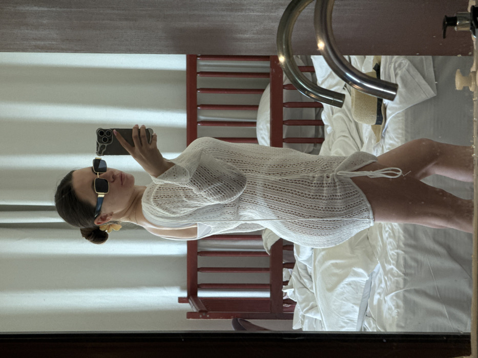 A female individual is depicted in an indoor setting, likely a hotel room or private accommodation, consistent with a leisure environment typical of locations such as Karon, Thailand. She is positioned in front of a mirror, taking a selfie with a dark-colored smartphone held in her right hand. She is turned slightly to her left, looking over her right shoulder into the phone's camera. Her dark hair is pulled back into a bun, and a yellow flower is tucked behind her right ear. She wears square-framed sunglasses with dark lenses and gold-colored frames. Her attire consists of a white, loosely knitted, long-sleeved short dress or cover-up over a white garment. In the reflected background, a bed with rumpled white sheets is prominent, featuring a red wooden headboard with vertical slats. Behind the bed, light-colored curtains are visible. On a surface or floor near the bed, a straw hat with a dark band rests. The lower right foreground of the image, reflecting the area in front of the mirror, shows parts of two metallic sink taps (one silver, one brass-toned) and a white soap dispenser.