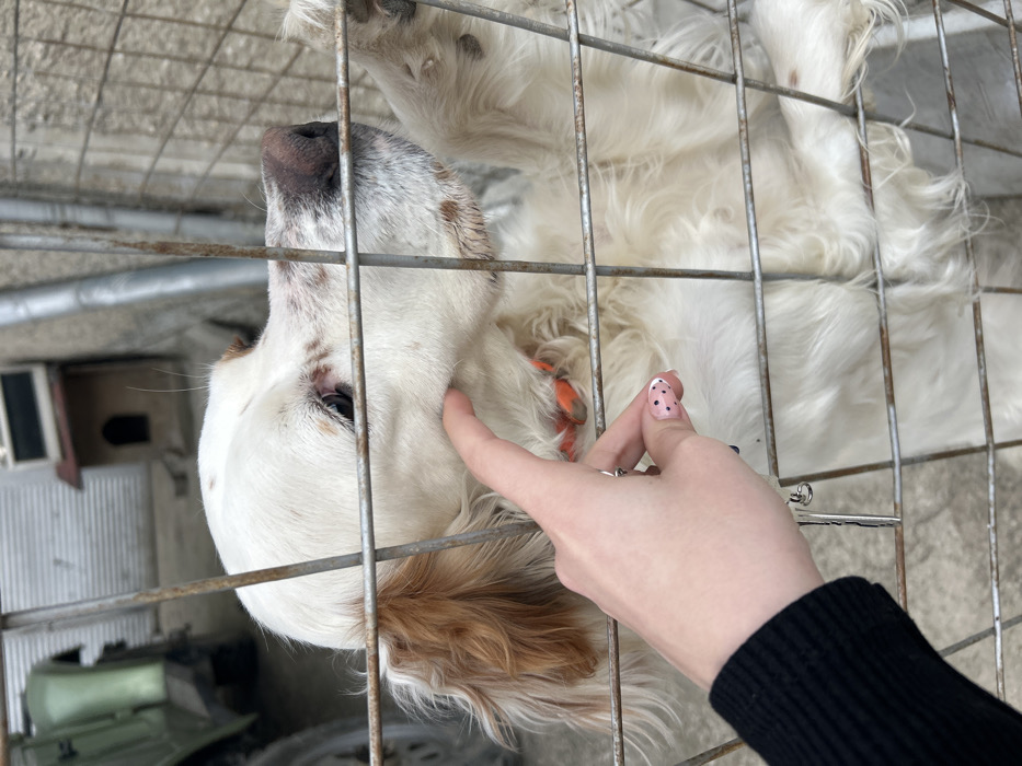 The scene, located in Shumen, Bulgaria, depicts a human hand interacting with a dog through a rusted wire mesh fence