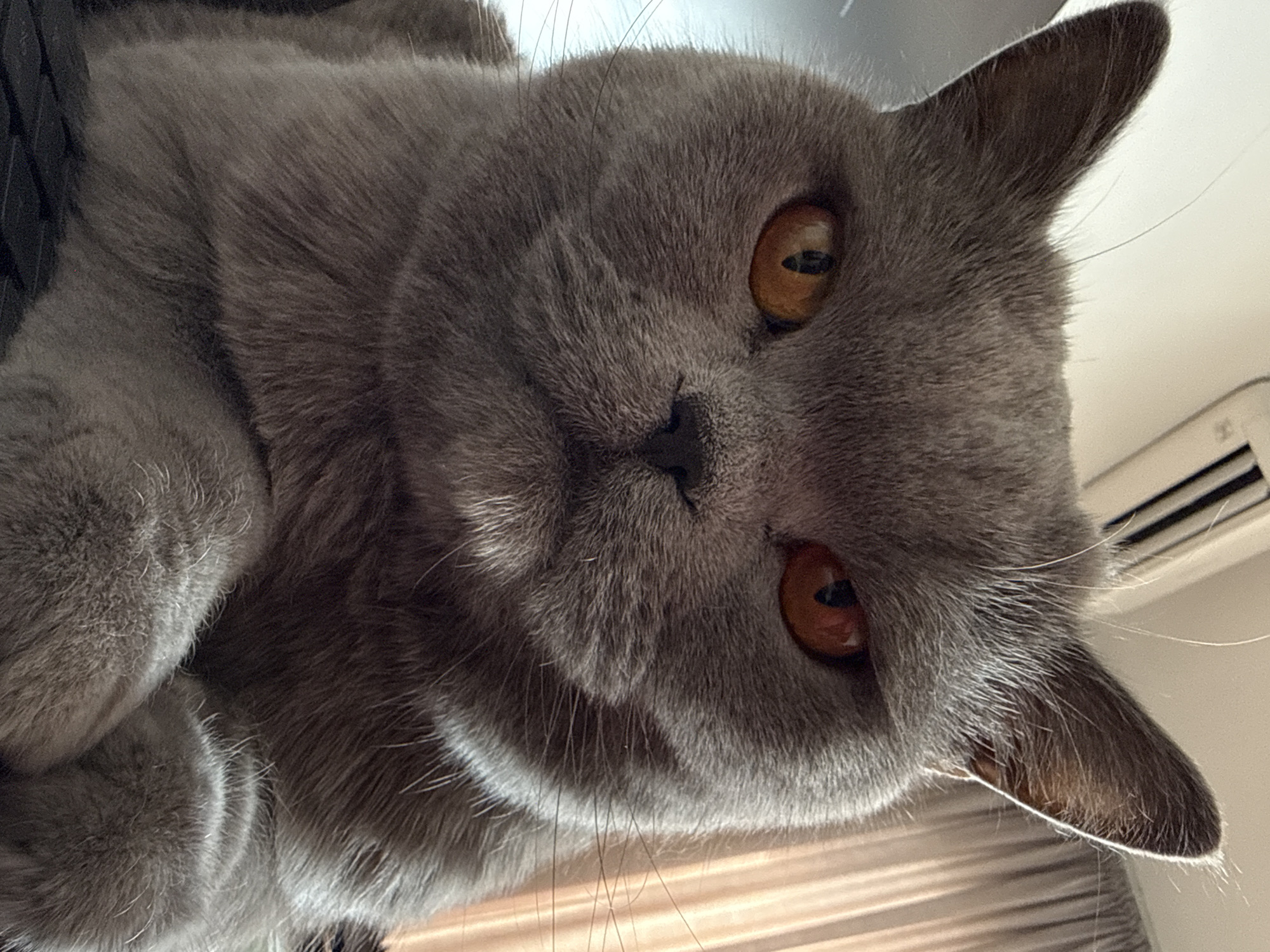 A grey, short-haired feline, consistent with a British Shorthair breed, occupies the majority of the frame, facing directly towards the viewer. The cat possesses prominent amber-orange eyes with vertical pupils, a short nose, and visible whiskers extending from its broad facial structure. Its ears are upright and pointed. The animal's front paws are partially visible at the bottom edge, resting on a dark, patterned surface consistent with a computer keyboard. In the upper left background, a portion of a white air conditioning or ventilation unit with black grates is visible against a light ceiling. To the upper right, light-colored, vertically pleated curtains are present, indicating an indoor setting. No discernible details within the image allow for the identification of a specific city or geographical location.