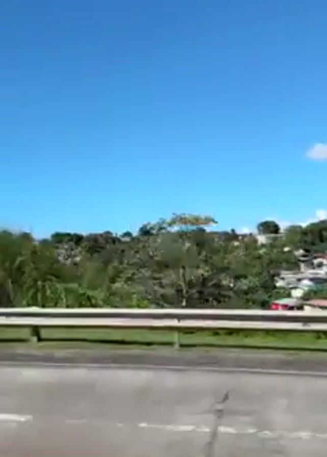 The video is shot from a moving car, showing the view from the passenger side. A grey road is visible in the foreground, separated from a field by a white guardrail. Beyond the guardrail, there is lush green vegetation, including tall grasses and various trees. Occasionally, buildings can be seen through the foliage. The sky is a clear blue with a few small clouds. Electric power lines and poles are also visible against the sky.