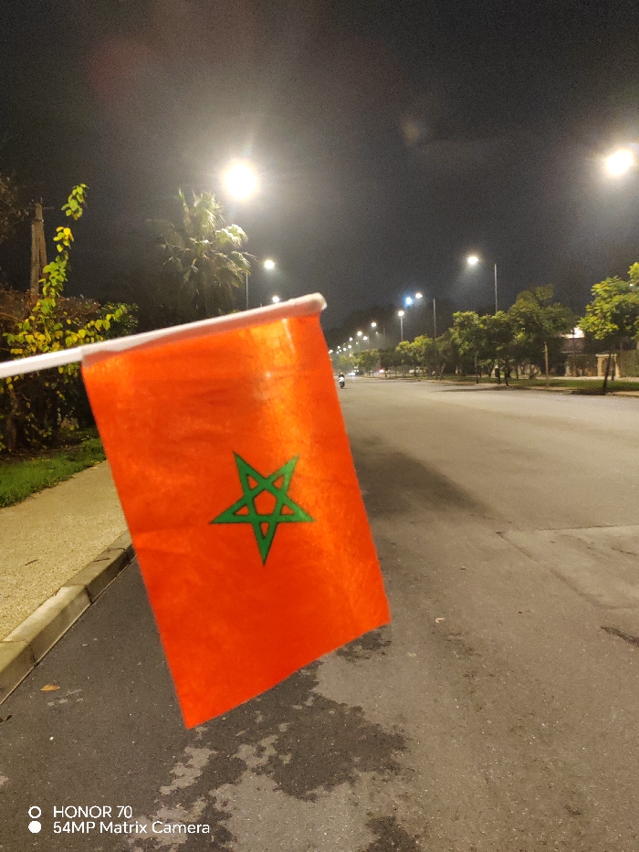 - "A small Moroccan flag with a green star is held up on the side of a road at night" by FM-z9Q8u2, licensed under CC BY 4.0