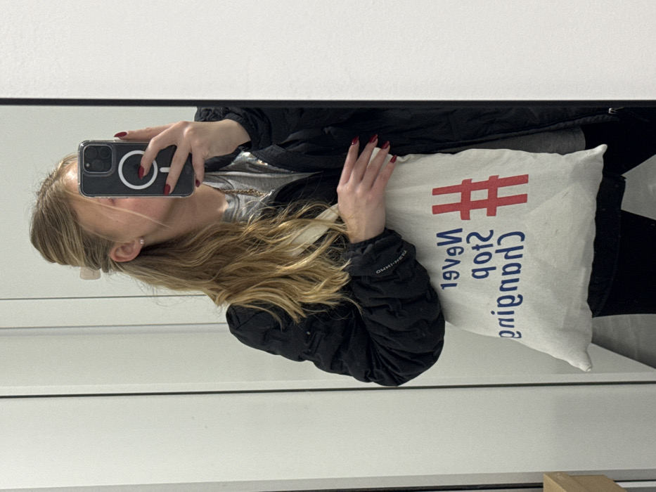 A person stands in front of a mirror, holding their phone in their right hand to take a selfie. The person has long, blonde hair and red nail polish. They are wearing a black jacket and a grey shirt. A tote bag with a red hashtag symbol and upside-down blue text is visible in their left hand. The background consists of a white wall and the edge of a mirror frame.