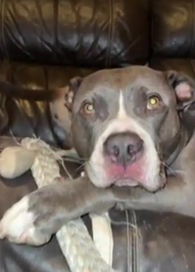 A close-up video shows a grey and white pitbull lying on a dark brown leather couch