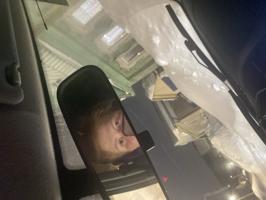 interior of a car at night. A rearview mirror prominently reflects a person's face with light eyes. The car's dashboard and part of the windshield are visible, coated in what appears to be snow or ice. The background, visible through the windshield, is blurred but shows the exterior of a building, possibly a house, with what seems to be snow-covered details.