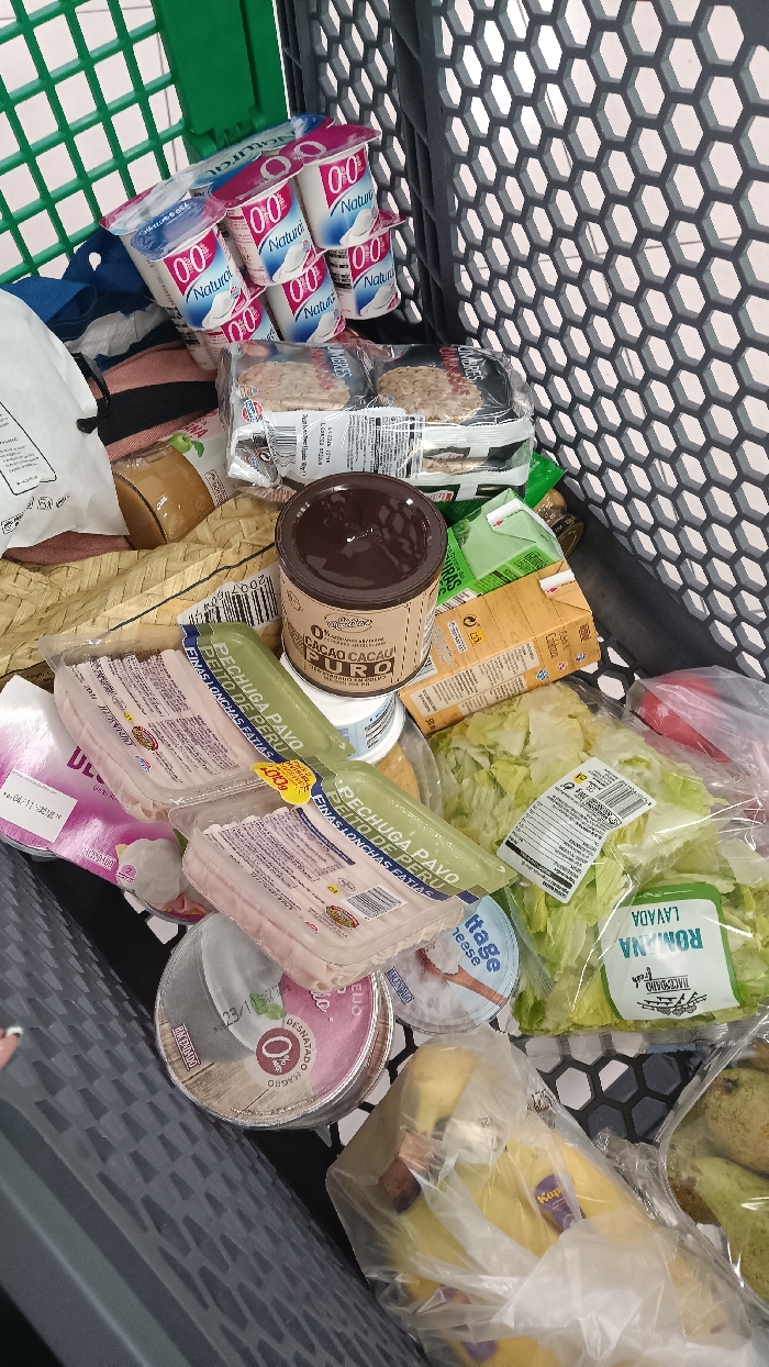 This image depicts the interior of a gray shopping cart filled with various grocery items within a supermarket environment in El Port De Sagunt, Spain. The cart contains numerous packaged food products. Essential details include: eight containers of "0.0% Natural" yogurt, two packages of "Pechuga Pavo Finas Lonchas" (thinly sliced turkey breast), a can of "0% CACAO CACAO PURO" (pure cocoa), a package of round crackers or rice cakes, a plastic bag of pre-washed "ROMANA LAVADA" (romaine lettuce), a plastic bag of bananas, and a plastic bag containing green pears. Also visible are a container of cottage cheese, another container of a "0% desnatado" (skimmed) dairy product, a small liquid carton, and a jar with a brown lid. The items are unarranged, suggesting an ongoing shopping activity. The background, visible through the hexagonal pattern of the cart's side, shows a light-colored tiled floor. A partial view of a human hand or fingernail is present in the lower-left corner. No individuals are fully depicted.